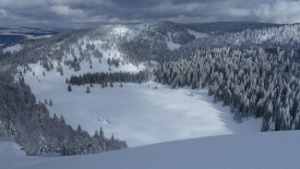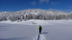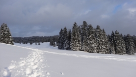 Nous arrivons à la jonction du sentier qui rejoint la Bourbe. Monter dans le cirque ne nous semble pas une bonne idée… Même si les avalanches ne sont pas légion dans le Jura, mieux vaut quand même ne pas tenter le diable. Nous monterons donc par la crête, sur la droite.