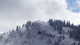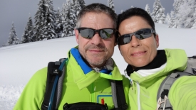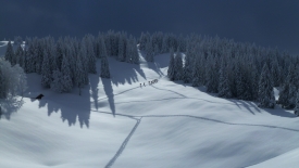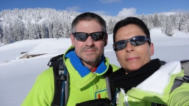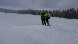 Nous pique-niquons à proximité des panneaux jaunes. Un groupe arrive, venant de la Bourbe. Une dizaines d’hommes en raquettes. Ils commencent à dessiner un cercle dans la neige. Stefano lance : « A quelle secte appartenez-vous ? » Nous engageons ainsi la conversation et échangeons moultes plaisanteries. Ils nous annoncent que le prix d’entrée est fixé à 8’000 euros payables également en francs suisses. Stefano demande : « Le guru, c’est celui qui a la barbe la plus longue ? » Nous éclatons de rire en les voyant tous porter la main au menton, pour mesurer la longueur de leur barbe. Avant de partir, nous leur faisons l’offrande de deux Clif Bars.