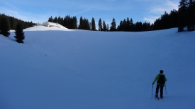 Le chalet de la Foirausaz. Pour éviter de marcher en dévers, nous descendons dans le trou (et la température en profite pour descendre également d’au moins 10°) avant de remonter (la température itou). J’ai les poils du nez qui gèlent (ouais je sais, c’est pas très féminin ni délicat mais… 1. tout le monde à des poils dans le nez – même les stars – 2. c’est la vérité !)