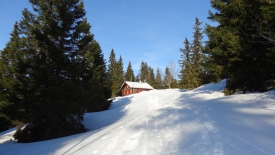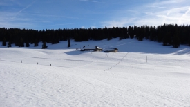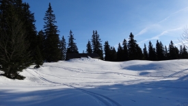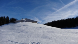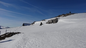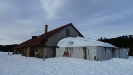 Nous sommes surpris de voir que le toit n’a plus une once de neige et que surtout le devant du chalet est dégagé. La différence est flagrante par rapport au précédent chalet. Nous échafaudons diverses hypothèses : peut-être est-ce la tôle qui constitue le toit, peut-être des gens sont-ils venus déblayer ? Autant de question qui restent ouvertes.