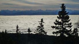 Nous quittons la maison sous le stratus. Nous sortons de la grisaille à Saint-George. Comme le remarque Stefano, le village est coupé en deux : en bas, dans le brouillard, en haut, sous un ciel limpide.