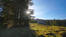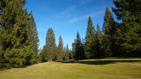 A proximité de La Pivette, nous quittons le sentier des Crêtes pour suivre les contours d’un pâturage boisé qui nous amène à la hauteur (en altitude) de L’Eglantier.