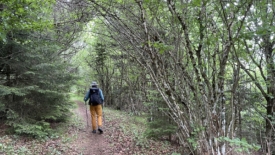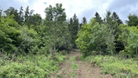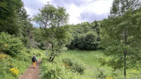 Le sentier continue entre forêt et prairie non fauchée.