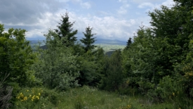 Arrivés à ce que nous pensons être le point le plus haut, nous bénéficions d’une mini trouée dans les arbres. Au-delà du puy de la Rodde, il nous semble apercevoir le puy de Monténard. Mais les nuages sont bas, masquant partiellement l’horizon, nous laissant incertains.