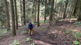 Nous trouvons un sentier de VTT qui descend perpendiculairement aux pelures d’oignon. Sur le tracé, notre itinéraire coupe le puy en diagonale.