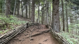 Le sentier, joliment aménagé, canalise les randonneurs par des barrières basses de bois tressés.