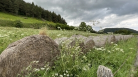 Ici d’ailleurs, l’herbe et le foin ne manquent pas. Pour preuve ces rouleaux de foin séché, alignés abandonnés au bord d’un vaste champ d’herbe haute, où paissent des chevaux qui ont de quoi mangé pour tout l’été au moins. De l’herbe commence à pousser dessus. Le cycle est presque complet.