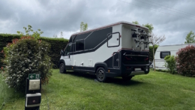 Il était 19 heures à notre arrivée au camping. Devant la porte de la réception, un tableau blanc sur lequel est écrit en orange, en écriture liée : Bienvenue à Marie-Catherine et Stefano – Joëlle et Jean-Louis. Par chance, la réception est encore ouverte bien qu’une feuille collée sur la vitre annonce : fermeture à 18h. Nous sommes reçus par Florian et Stéphanie sans chichi et avec un grand sourire. La paperasse à remplir est inexistante et nous voilà bientôt en train de choisir notre emplacement. Le premier libre est le bon : plat, grand, avec une prise électrique et une prise d’eau à proximité. Sans parler des sanitaires à une cinquantaine de pas. Le tout dans un cadre de verdure luxuriante. Il nous faudra néanmoins mettre deux cales, pour être plus ou moins horizontal et ne pas avoir le sang s’accumulant dans la tête, une fois couchés. Il est d’ailleurs 22h30 lorsque nous éteignons les lumières, repus et ravis de notre organisation.