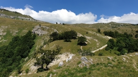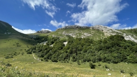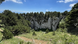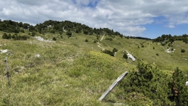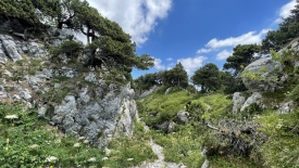 La route s’est arrêtée au chalet, se transformant en un joli sentier, qui chemine entre les lapiaz, les sapins et les pins.