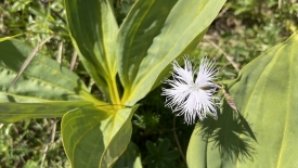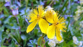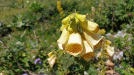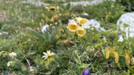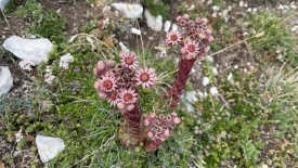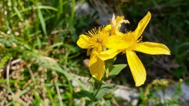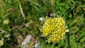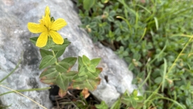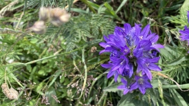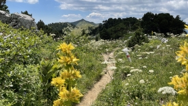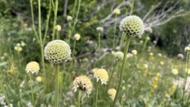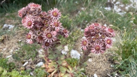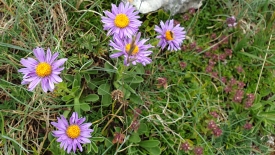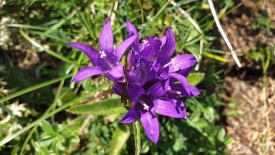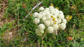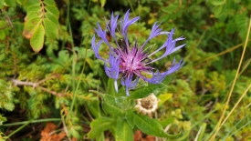 Le sentier dévie sur un point de vue. Il nous offre un replat d’une dizaine de mètres, que nous apprécions, un petit air chaud qui, sur nos tee-shirts détrempés, prend un air de climatiseur trois étoiles, une belle vue sur le lac Léman et la plaine à l’ouest de Genève, où la Suisse et la France se mélange et enfin, enfin, une nouvelle espèce de fleurs, les Céphalaire des Alpes qui ne se trouve nulle part ailleurs dans le Jura. Même pas à La Dôle qui pourtant, elle aussi, abrite quelques espèces endémiques.