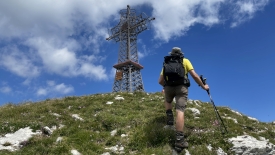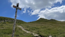 En approche… Pour éviter le sentier qui semble être bien érodé, nous contournons le sommet pour le prendre en venant de l’ouest. Ce qui laissera peut-être le temps aux randonneurs à côté de la croix de s’éclipser…