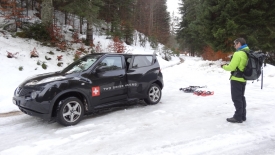 La route est verglacée et enneigée. Nous nous garons lorsque le bas de caisse racle la neige. Nous ne sommes pas loin des Orgères.