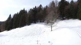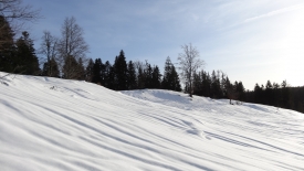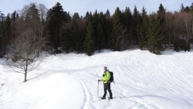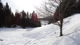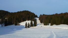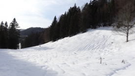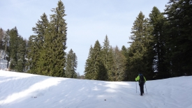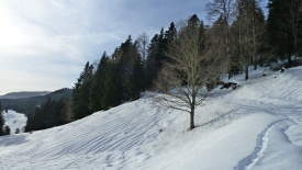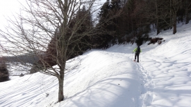Nous avons moult fois parcouru ce sentier l’été, au pas de course, en direction de la Grande Enne, du Mont Pelé, voir du cimetière des Bourguignons. Mais là, compte tenu de l’heure et des raquettes qui ralentissent notre marche, nous espérons tout au plus monter là où une bifurcation nous permettra de redescendre aux Bioles. Ce sera déjà pas mal.