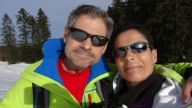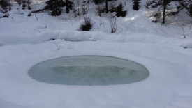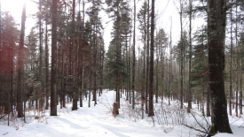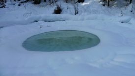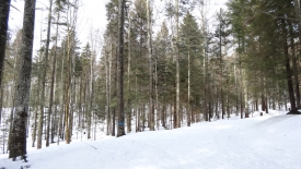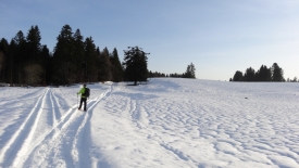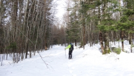 Nous trouvons une trace de moto-neige qui nous emmène à travers champ. Nous passons du soleil à l’ombre, avec brusque chute de la température.