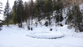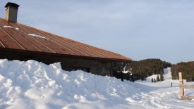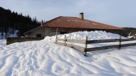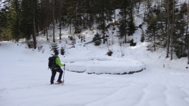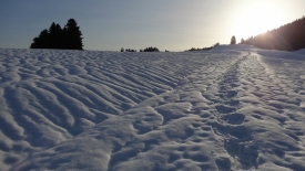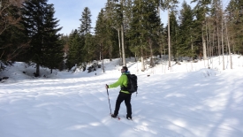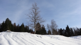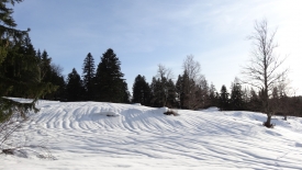La neige est mouillée et nous commençons par suivre la route qui monte aux Bioles. Nous marchons dans les ornières laissées par un tracteur ou un engin d’exploitation forestière. Nous marchons comme des mannequins, les pieds sur la même ligne. Comme quoi, la rando mène à tout !