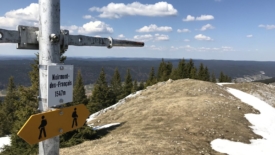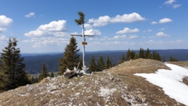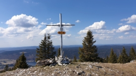 30 minutes après avoir commencé la montée, nous arrivons à la croix du Noirmont des Français. Décidément, ce coin est mal-aimé par un ou plusieurs énergumènes : si le panneau indicateur est maintenant dans le bon sens, une branche de sapin vient défigurer la croix. Non !