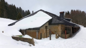 Devant la porte du Chalet de La Dôle, une kyrielle de skis dressés contre les murs. Un groupe de skieurs est assis contre le mur nord, à l’abri du vent.