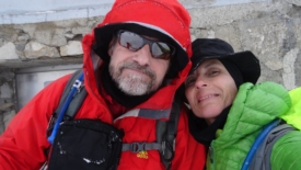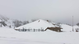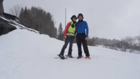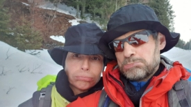 Lorsque nous arrivons au Chalet de la Dôle, il se met à neiger des petits flocons bien gelés et bien acérés qui, avec le vent, se font un plaisir de nous piqueter le visage. Étonnamment, Stefano reste stoïque. Bon à part la moue dépitée qu’il affiche sur la photo !