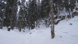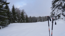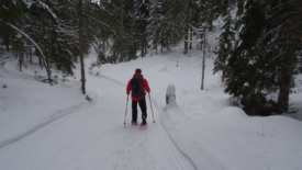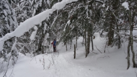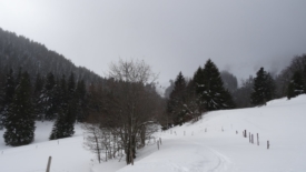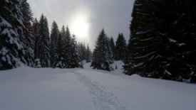 Lorsque Stefano corrige notre trajectoire afin de nous diriger vers la voiture, nous trouvons une trace de ski qui s’enfonce dans la forêt. Les arbres se resserrent et la pente s’accentue. Soudain, la trace disparaît. Nous continuons à pas mesurés alors que la déclivité s’accentue encore. Pendant un instant, nous envisageons de remonter car nous n’aimons pas prendre de risques et là, nous sommes en plein dedans. Mais un peu plus bas, à quelques mètres, nous voyons des promeneurs. Le chemin est là. Les dernières mètres se font en glissage plus ou moins contrôlée.