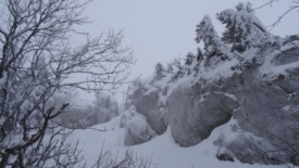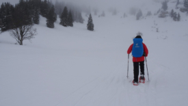 La montée vers le Chalet des Apprentis se fait dans le brouillard, en criant de temps en temps afin qu’un skieur éventuel ne nous télescope pas. Les skieurs, on s’en méfie. Plus particulièrement des skieurs lyonnais… La neige, collante, a une méchante tendance à s’accumuler sous les raquettes. Chaque pas est plus lourd que le précédent avant que, au bout de dix à quinze pas, elle ne se détache d’un coup. Puis, pour les deux prochains, nous nous sentons tout légers et le cercle vicieux se répète.