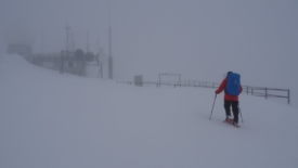 Des ombres fantomatiques errent sur le plateau. Un groupe en raquettes, des skieurs de randonnée. Nous nous blottissons contre le mur d’un des bâtiments pour nous abriter du vent et c’est là que nous pique-niquons. Le thé chaud est le bienvenu.