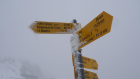 Nous nous remettons en mode montée toujours sans visibilité. Je perds la notion du temps et me laisse guider par les deux points oranges qui me précèdent. Gauche, droite, gauche, droite…Je suis toute surprise, lorsque je lève les yeux, de voir les bâtiments de Skyguide. Wow, nous y sommes déjà.