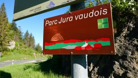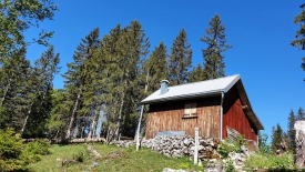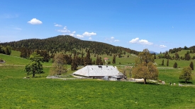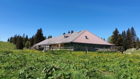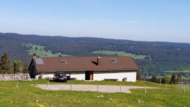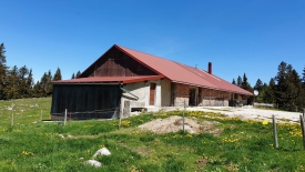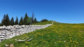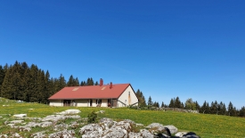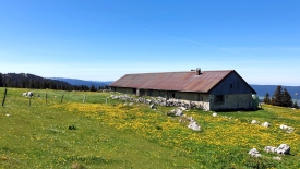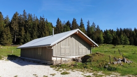 Pour la première fois, nous partons vers le chalet du Communal de l’Abbaye. Une voiture nous dépasse. Ce n’est pas bon signe. Surtout lorsque nous la voyons s’arrêter devant le chalet. Ah, peut-être est-ce finalement une manifestation du diable ? Derrière le chalet, la Dent de Vaulion.