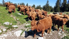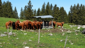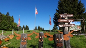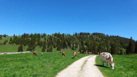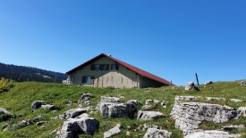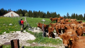 Lorsqu’ils entendent nos voix les bergers sortent. Nous pouvons ainsi papoter quelques minutes, voire dizaines de minutes. Ils ont le temps semble-t-il. Il nous raconte qu’avant, non loin de là, il y avait des mines de fer. Nous parlons de la combe de la Verrière où les verriers s’étaient installées. Nous évoquons également les toblerones, qui, s’ils font partie du paysage suisse, ne sont pas toujours appréciés. Il nous dit avoir essayé de s’en débarrasser d’un à coup d’explosif, sans succès. Trois vaches pleines sont dans le champ, juste à côté du chalet. L’une d’elle, noire, va sans doute donner naissance à des jumeaux. C’est vrai qu’elle est énorme. Nous nous promettons de repasser bientôt afin de voir les bébés.
