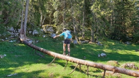 En repartant, un tronc suspendu me fait un clin d’œil. Moi qui ai toujours de la peine pour traverser les rivières en crue et au courant impétueux. C’est l’occasion rêvée pour s’entraîner. Il est suffisamment haut pour que son passage soit un peu challenging. Mais en même temps, en tomber, ne devrait pas provoquer trop de bobos.