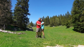 Nous arrivons devant la cabane des Italiens et constatons qu’un monsieur est assis devant, sur le banc. Stefano ne se démonte pas et lui demande si ça le gêne que nous le prenions en photo avec le chalet. L’idée n’a pas l’air de l’enchanter et il propose d’aller se cacher. Yes! Nous n’aurons donc pas fait ce grand détour pour rien.