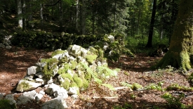 Nous continuons donc un moment sur la route qui mène aux Frasses avant de reprendre le sentier qui monte également aux Frasses mais de manière plus directe. Nous arrivons à un endroit que nous aimons tout particulièrement : nous rejoignons un angle droit d’un vieux mur de pierre moussu à souhait.