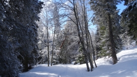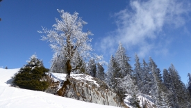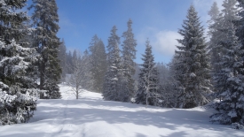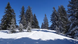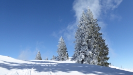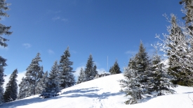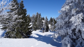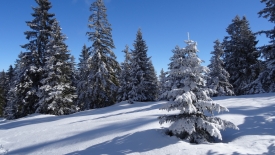 Les sapins ont deux visages : la face à l’ombre est blanche, recouverte de neige. De l’autre côté, la neige n’est plus et le vert sombre des aiguilles ressort.