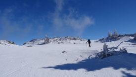La neige est dure, gelée mais recouverte par 2 cm de neige fraîche. À condition qu’elle n’ait pas été soufflée. Une très belle combinaison, confortable et nous permettant un rythme de marche assez soutenu. Aujourd’hui, je n’ai aucun problème pour mettre le cœur, les poumons et les jambes d’accord.