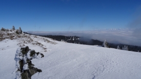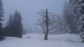 Je ne sais pas ce qui nous prend aujourd’hui mais à 10h15, nous sommes garés non loin du Col du Marchairuz, au parking du point de vue. Le bassin lémanique est dans le brouillard, un brouillard épais et dense. Tout comme celui que nous trouvons au départ du sentier.