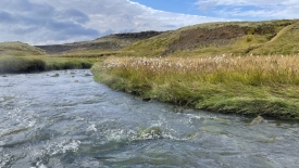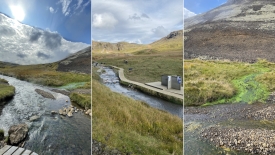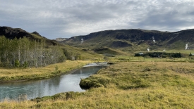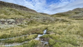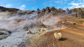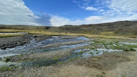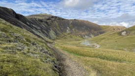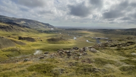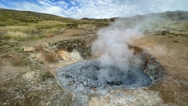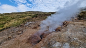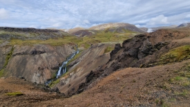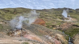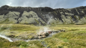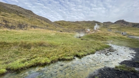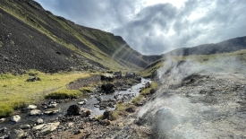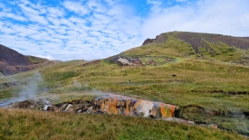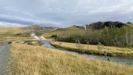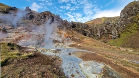 Nous faisons un détour par Hveragerði et laissons la voiture à Rjúpnabrekkur. De là part un sentier qui nous emmène d’abord à proximité de petits bassins et solfatares. Montant parfois abruptement, il suit un torrent – Reykjadalur – qui, 3 km après notre départ est aménagé pour la baignade.