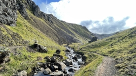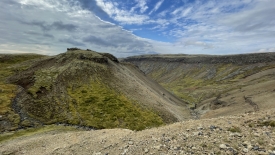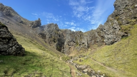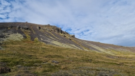 Je m’éloigne un peu afin d’explorer la vallée qui se termine par un petit cirque. Le ruisseau – Klambragil – sort d’un des plis de la roche.