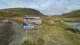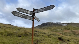 Voici les panneaux de marquage des sentiers islandais. Nous n’avons marché qu’un peu plus de 3 km. Rjúpnabrekkur, c’est supposément le nom du parking où nous avons laissé la voiture. Le symbole du couple de randonneurs est assez drôle, elle en robe, et sans sac à dos.