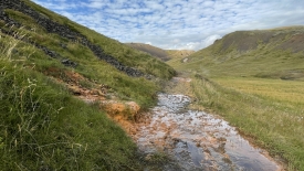 Le sentier commence en une large piste gravillonnée qui traverse des prés, dans lesquels coule un ruisseau. La couleur des algues qui s’y développent et de la mousse qui le borde laisse présager une température au-dessus de la normale, de même qu’une composition d’eau plus complexe que le simple H20.