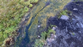 Le sentier s’étale entre le cours d’eau et une petite montagne de cailloux volcaniques. La mousse s’y accroche par plaque, colonisant l’espace.
