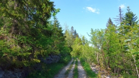 Nous descendons par la route qui traverse le bois de la Sauge. Elle n’en finit pas mais est très agréable, tant dans la montée que dans la descente. Nous l’avons maintes fois parcourue, que ce soit à pied, en raquette, en ski et même une fois, pour moi, en e-VTT.