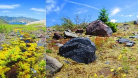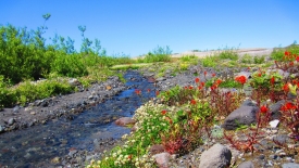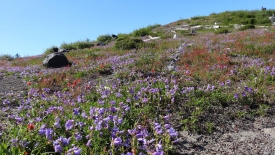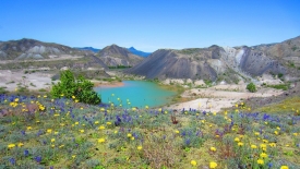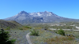 Le sol est recouvert de fleurs : des Lupines, qui d’ailleurs furent les premières plantes à repousser après l’explosion et des Red Indians Paintbrush, sans oublier quelques marguerites.
