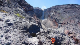 Pour plus de précision, la chute d’eau se trouve en haut de ce trou en forme d’œil qui commence juste après l’arrondi du cratère, sur la partie gauche de la photo.