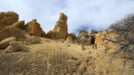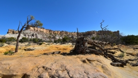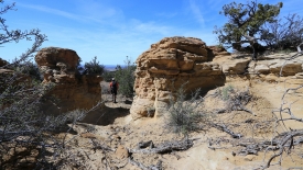 Nous longeons le bord de la mesa sur un peu plus d’un km avant de trouver un endroit où la falaise s’est écroulée et où il nous semble possible de passer.
