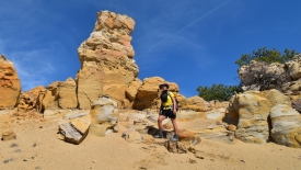 Il y a des moments intenses, comme celui où je ne ne sais plus où poser les pieds. Je suis tous simplement coincée… Je pointe ce qui me semble être un endroit accessible et Stefano me dit : n’y vas pas, tu vas te faire du mal… Curieuse, je jette néanmoins un coup d’œil pour voir, et, derrière une corniche, un gros trou noir dans le sable, creusé par le pluie… dont je ne vois même pas le fond. Mince, j’ai un moment de doute. Je regarde Stefano et lui dit : on est un peu limite, là, non ? On y est presque, me répond-il. Il n’a pas tort, d’autant que remonter serait presque impossible. Je me mets accroupie et me laisse donc glisser.