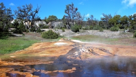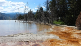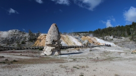 Bon c’est joli tout ça mais à midi nous avons fait le tour. Mammoth Hot Springs, c’est vraiment un des points les plus touristiques de Yellowstone. Des cars débarquent des myriades d’asiatiques et d’indiens (d’Inde). Nous nous amusons de l’enthousiasme des asiatiques (chinois pour la plupart) qui s’exclament devant chaque source, se prennent en photo en s’interpellant bruyamment.