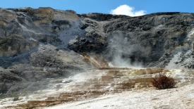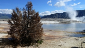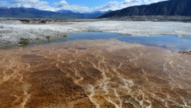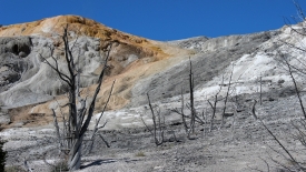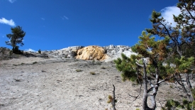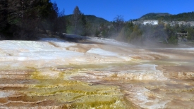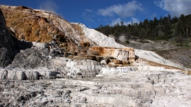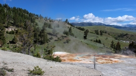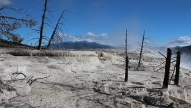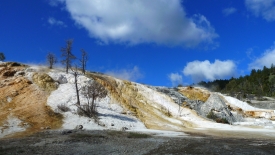 Le ciel est infiniment bleu au réveil. Le programme de la journée (en tout cas du début de journée) est tout tracé : se promener parmi les sources chaudes et les cascades de travertin de Mammoth Hot Springs.