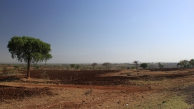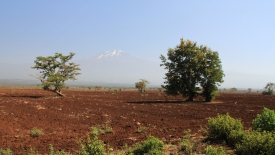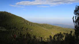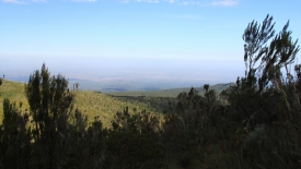 Au loin, la plaine, la ville de Moshi et un lac (le Nyumba ya Mungu Reservoir).