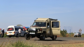 Nous partons dans les rues animées et encombrées d’Arusha. La conduite de Richard est très … intéressante. Une nationale défoncée, une file de voitures à l’arrêt pour cause d’embouteillage (nous allons dans le sens de cette file), quelques voitures qui arrivent en face, et une voie juste pour Richard, à cheval sur la ligne blanche, obtenue à grands coups de klaxon. Et si vraiment quelque chose de très gros arrive en face, eh bien 3 coups de klaxon suivis d’une queue de poisson pour se rabattre. Intéressant, disais-je.