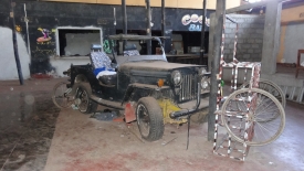 Un garage avec au fond les girls rooms et une jeep au milieu.