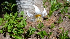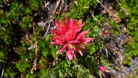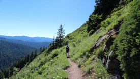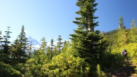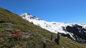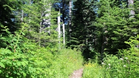 Nous dépassons un randonneur, aperçu de matin en montant. Je lui dis : Hi again, we saw you this morning. Sans doute cette reconnaissance déclenche-t-elle quelque chose car il nous rattrape et nous dit : dans quelques centaines de mètres, il y a un sentier qui part sur le gauche. Prenez-le. Vous aurez une belle vue sur le Mount Hood et les prés sont couverts de fleurs. C’est un petit détour mais ça vaut la peine.